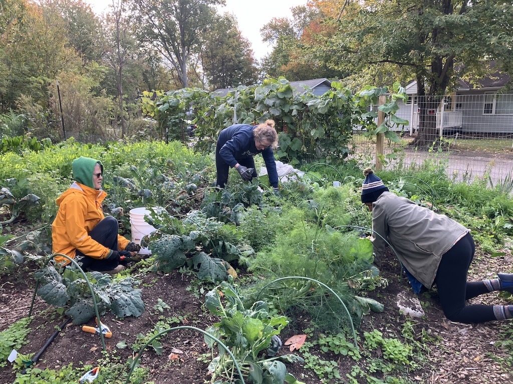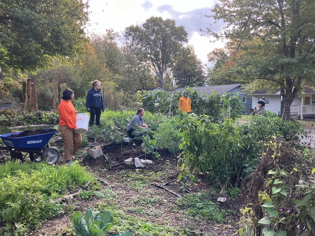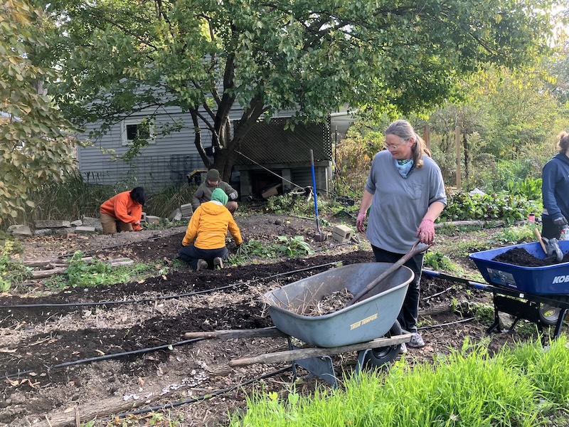 This morning’s gathering in the garden really did feel like a party. Seven people in all, working to clear weeds and put down leaf mulch. I was there for the first hour only. 9:30-10:30. The job was done before noon. Busy hands make light work!