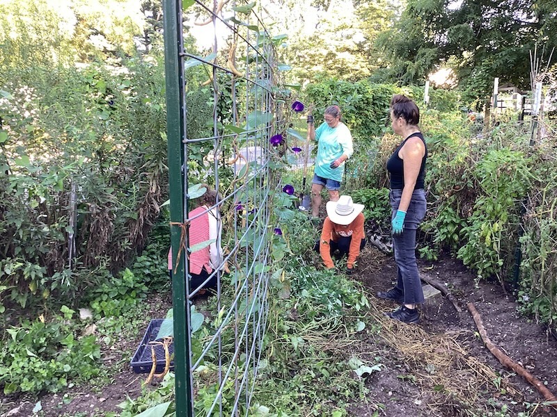 Starting to put part of the garden to bed . . . Elisha, our fearless leader, to the left, with Marita, who lives here, and neighbors Wendy and Marcella.