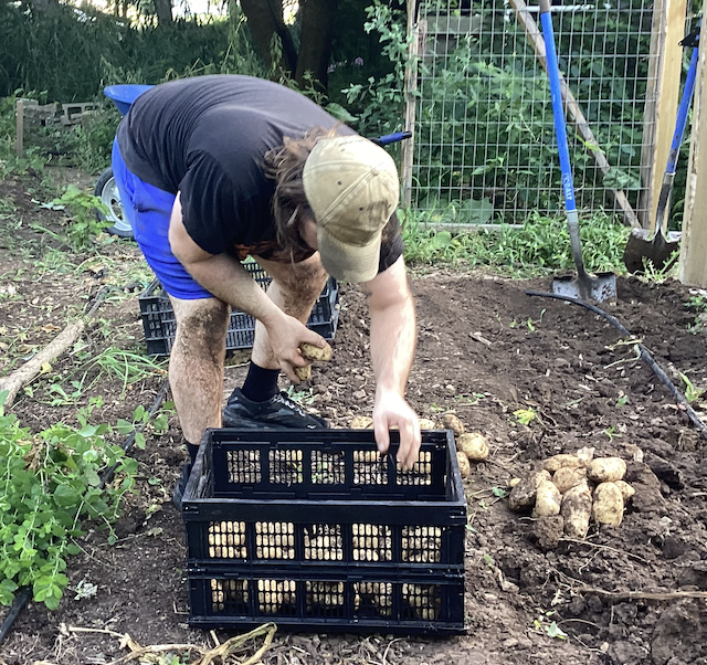 Friend Ben Herr and Elisha were out in the garden Sunday AM early to harvest more potatoes and onions —
