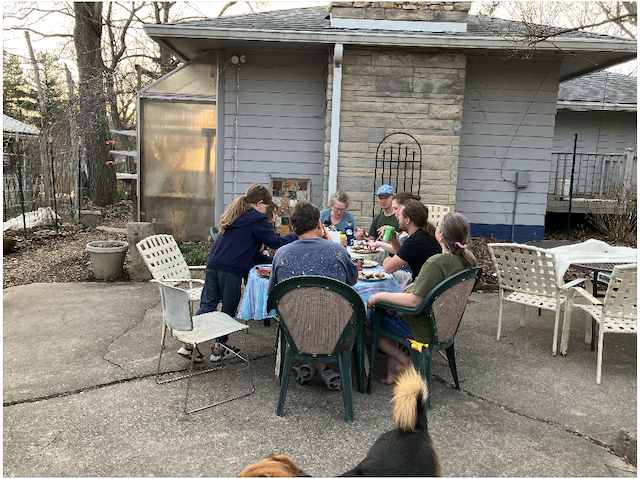 This past Thursday, we eagerly looked forward to having our twice-monthly Community Dinner, for the first time this year, out on the patio (rather than in either my house or Elisha and Dave’s house). The temp was okay . . .but: the wind, it turned out, was fierce! We huddled behind the house, which kind of broke the wind, but not really.