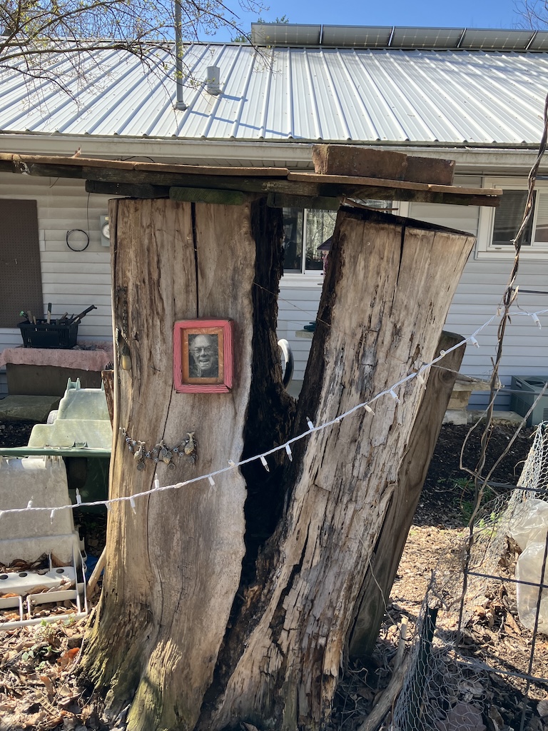 And finally, here’s the old stump, with my late husband Jeff’s photo still attached, even though half of it broke away this past week, after, let’s see now, how many years ago did I get that tree cut down? Likely two decades ago.