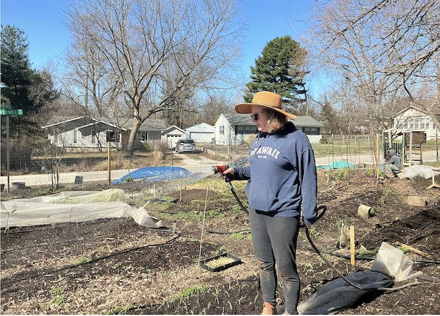Boss lady Elisha waters garden.