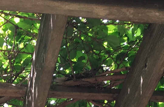 The nest was up somewhere in the tangled mass of kiwi that serves as a shady roof in the summer here.