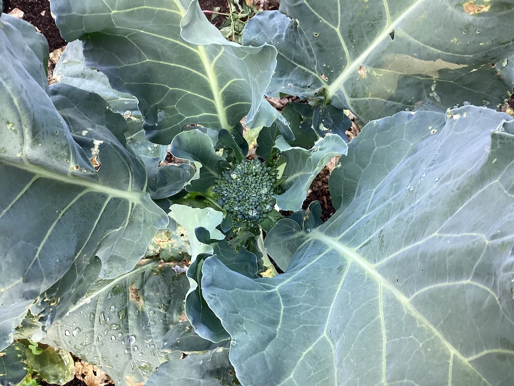 Broccoli is coming along, having survived the harlequin beetle invasion (See last post.)